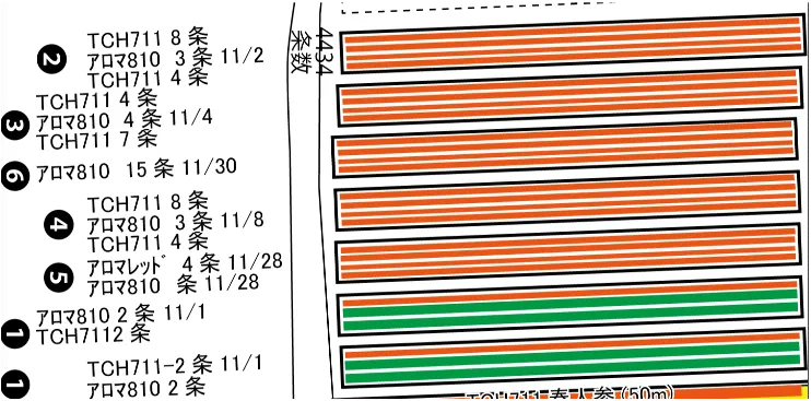 ※圃場No1東のアロマ809・810(8/15播種)は、成育初期に葉を虫でだいぶやられてしまし、残存状況がかなり悪く、収量がかなり少なかったです。1aで6コンテナ(80kg位)なので、通常(4t/10a)の20%位でした。