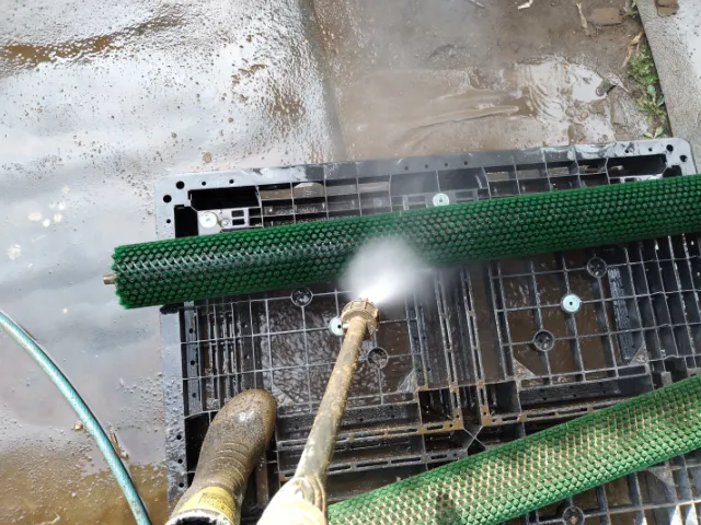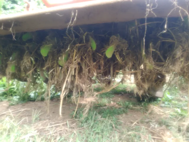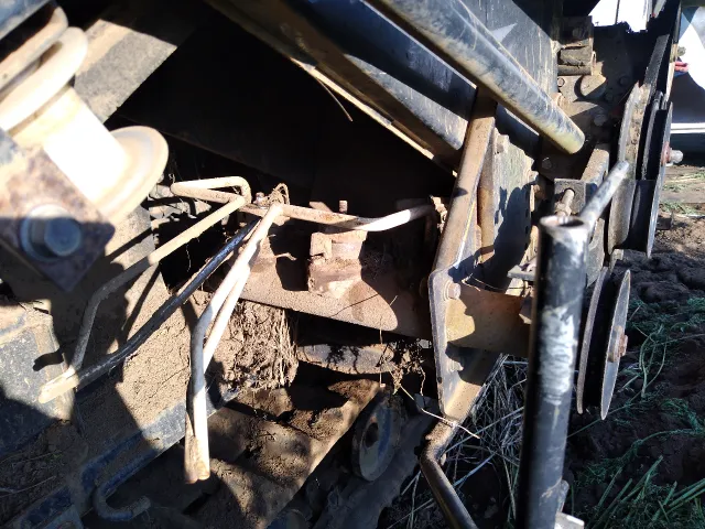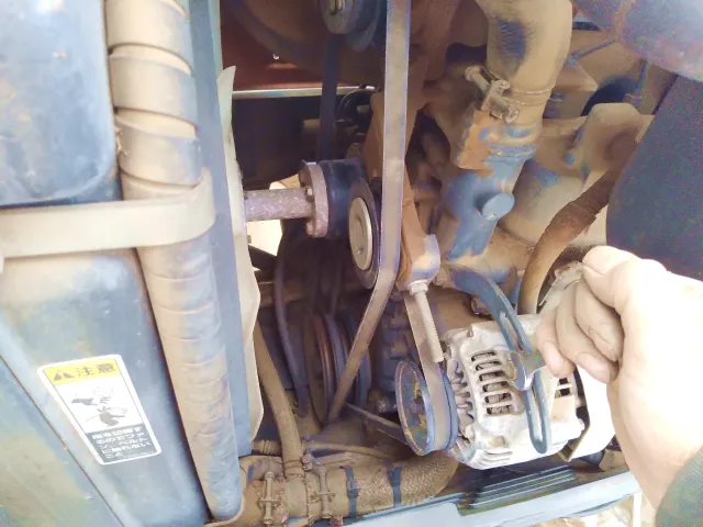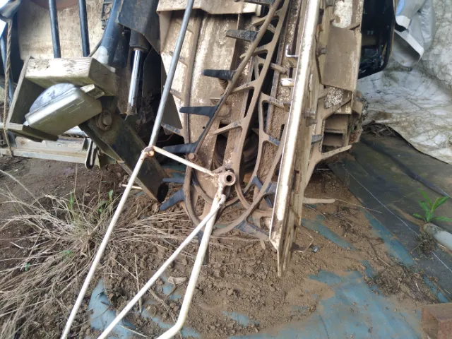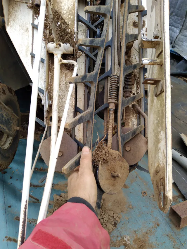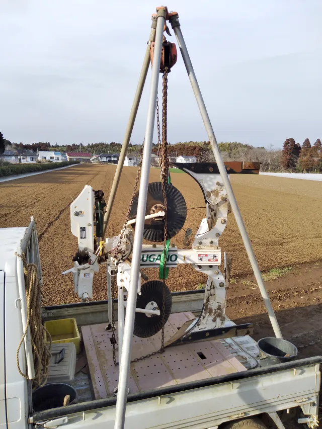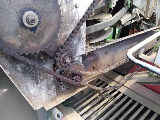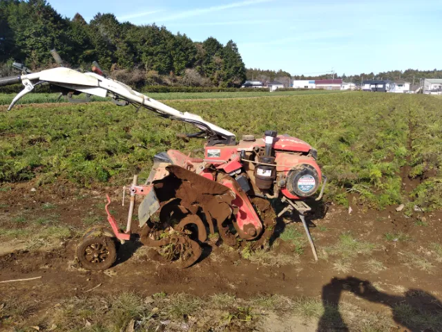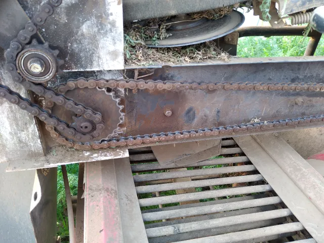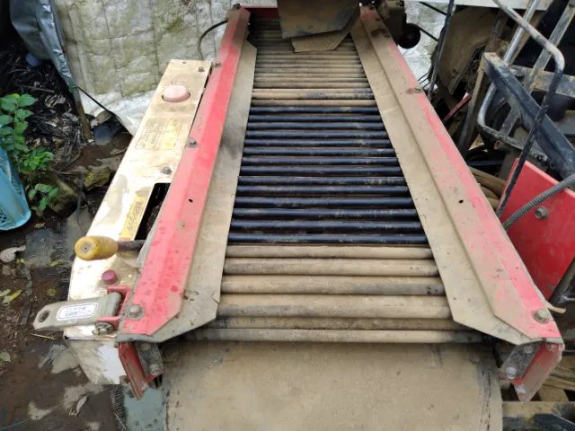 秋冬人参収穫終わりました 人参収穫機の掻き込みベルト・搬送ベルトが伸びないよう緩めました。