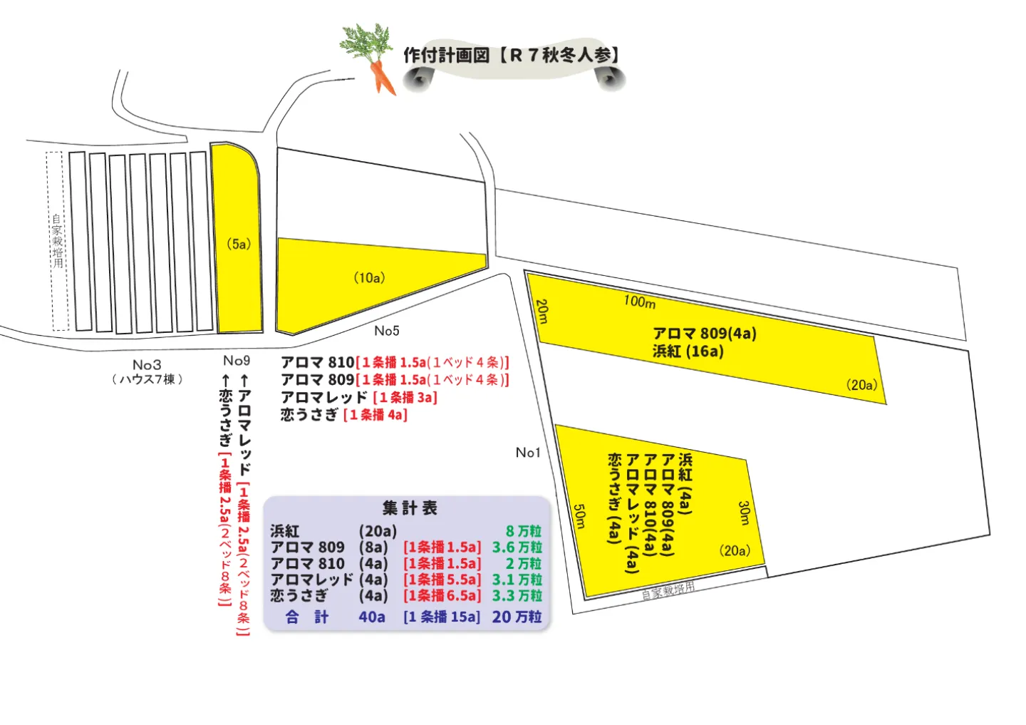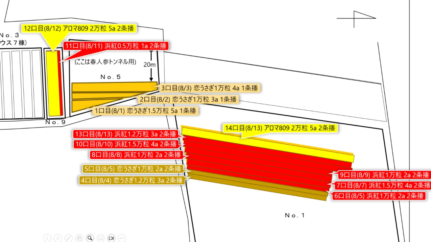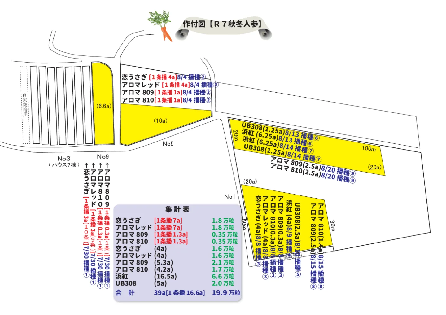 播種:人参(ハウス3棟目5口目)((南から)アロマレッド4条 アロマ810-4・3・4条 アロマレッド-0.3万粒 アロマ810-0.9万粒 株間6cm)