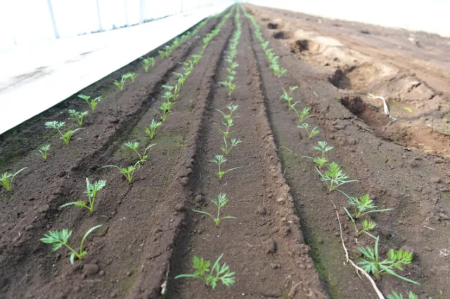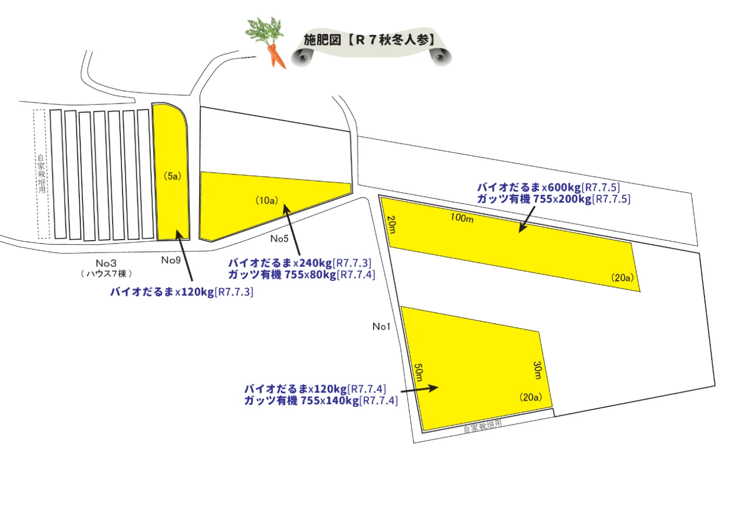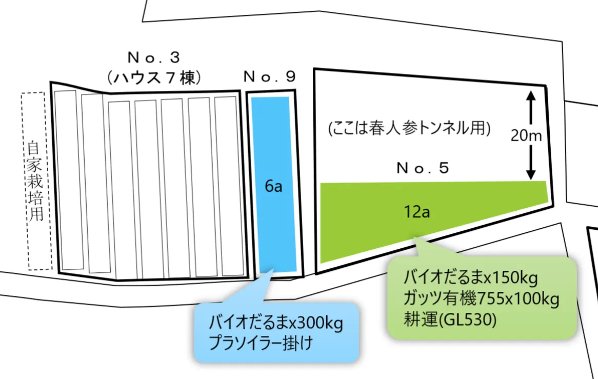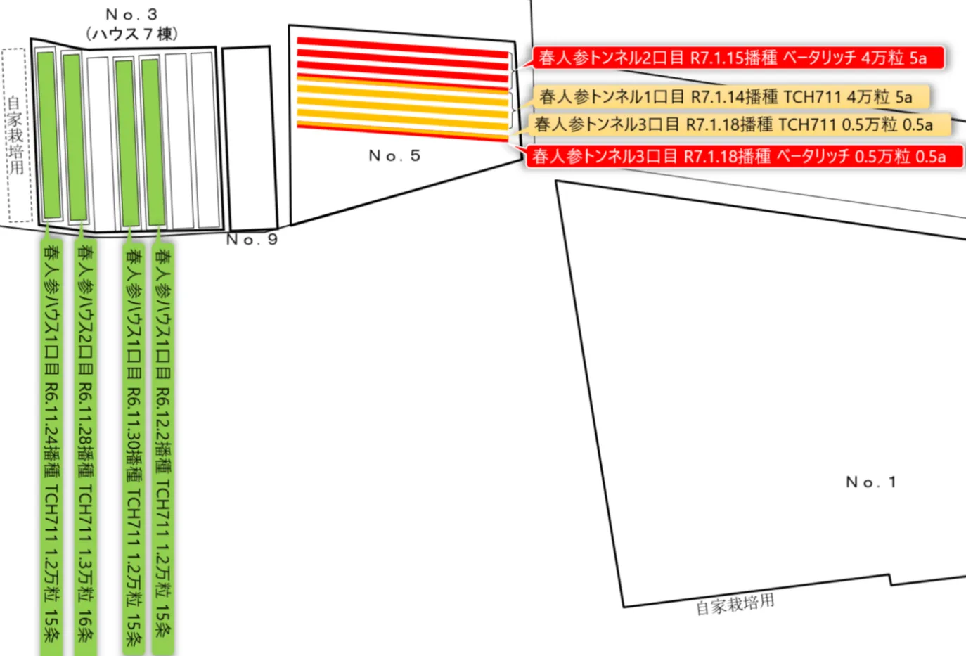 播種:人参(ハウス3棟目5口目)((南から)アロマレッド4条 アロマ810-4・3・4条 アロマレッド-0.3万粒 アロマ810-0.9万粒 株間6cm)